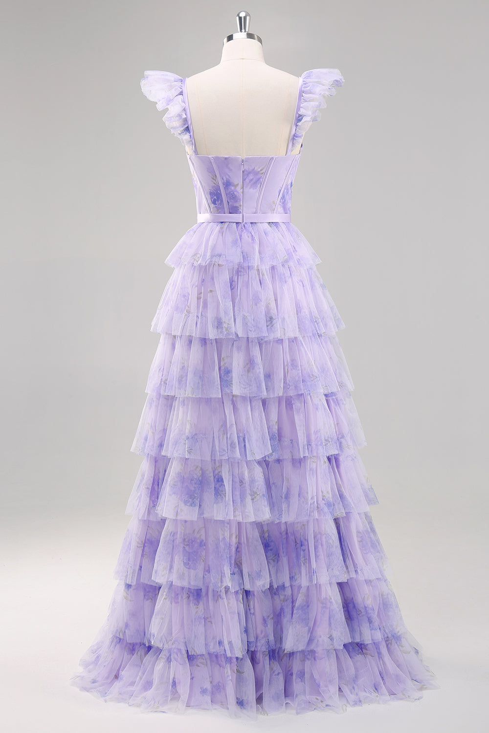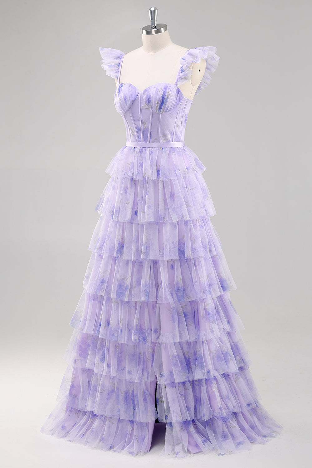 Lavender A Line Tiered Tulle Long Prom Dress with Slit